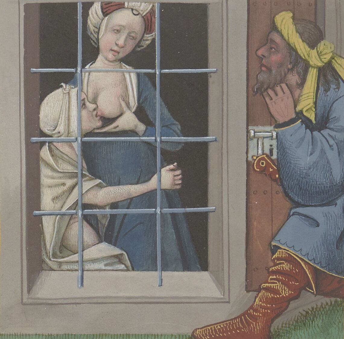 The Italian author mentions a "young Roman woman" whose name he admits not knowing, but he praises her piety and nobility. The anonymous girl's mother was sentenced to death, and while awaiting her sentence in prison, her daughter fed her with her own milk. The gesture moved the council, who permanently released the woman. Boccaccio concludes: "For such a pious act, a garland made of flowers is not sufficient."