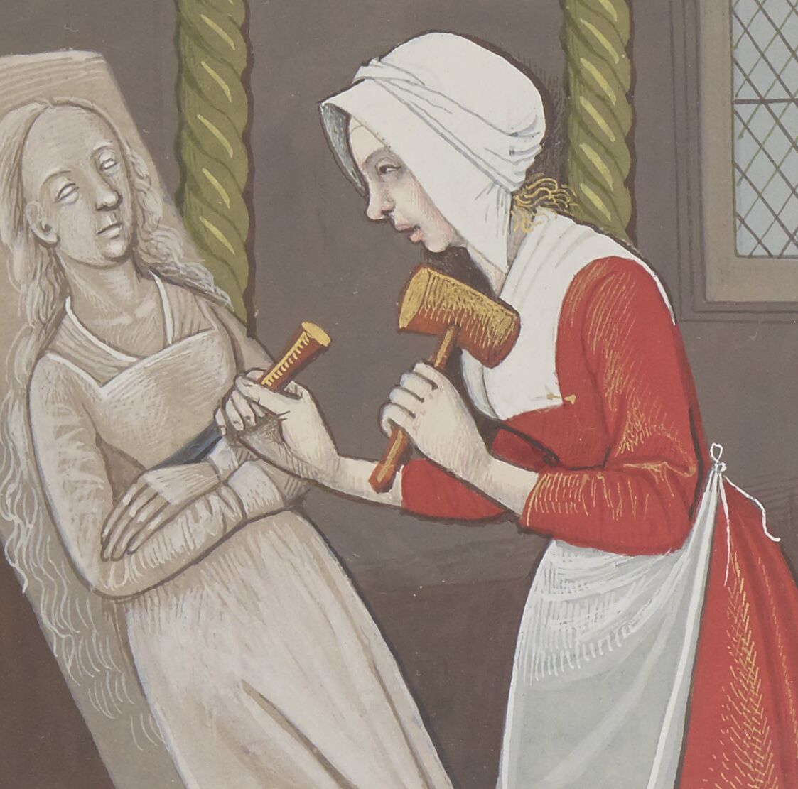 Boccaccio often emphasizes the inherent stupidity of women, even when he intends to praise one of his heroines. Regarding Nicaula, the queen of Ethiopia, he states that she "did not devote herself to idleness and feminine softness (…) but was endowed with knowledge." Similarly, when mentioning the painter Irene, he states: "I think she deserves praise because it is a difficult profession for a woman since it cannot be achieved without a very strong talent, which in women usually appears very late." He refers similarly to the painter and sculptress Marcia, who "disdained feminine tasks and idleness."