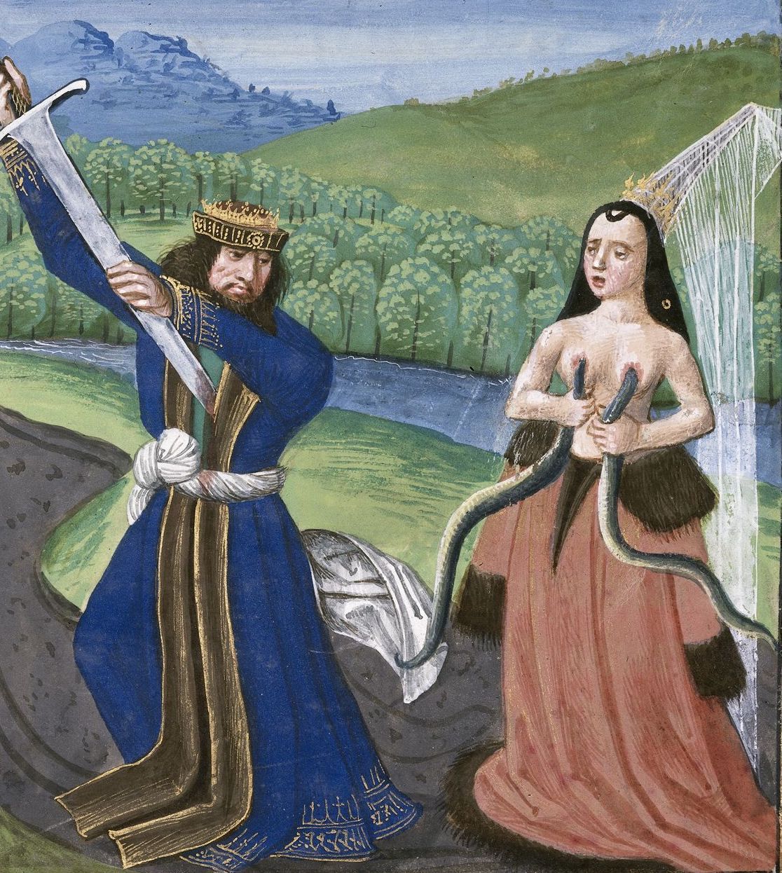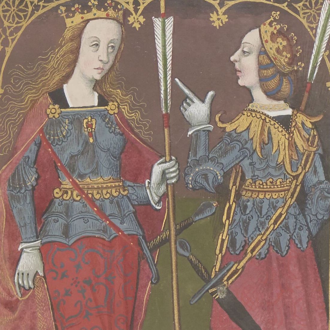 Finally, Boccaccio surprises by praising, in three separate chapters, the women he truly seems to admire: the Amazons. He dedicates two chapters to the sisters Marpesa and Lampedonia. These daughters of Mars took up arms after being widowed due to the plundering of an enemy army. They fought so fiercely against male enemies that the latter had no choice but to retreat. Once they established their political position, these warrior women procreated with men from a neighbouring tribe: "They would kill male infants immediately and carefully train the females for warfare. Even at a tender age, they would hinder the growth of their right breast using fire or some drug so that it would not hinder their adult proficiency in archery. They kept their left breast intact to nourish their offspring, which is why they were called Amazons. As they grew up, they did not educate the girls as we do ours, for they rejected sitting at the spinning wheel and other feminine tasks. On the contrary, through hunting, raiding, horse taming, working with weapons, arrows, and other similar exercises, they continuously strengthened the girls' skills and manly strength."