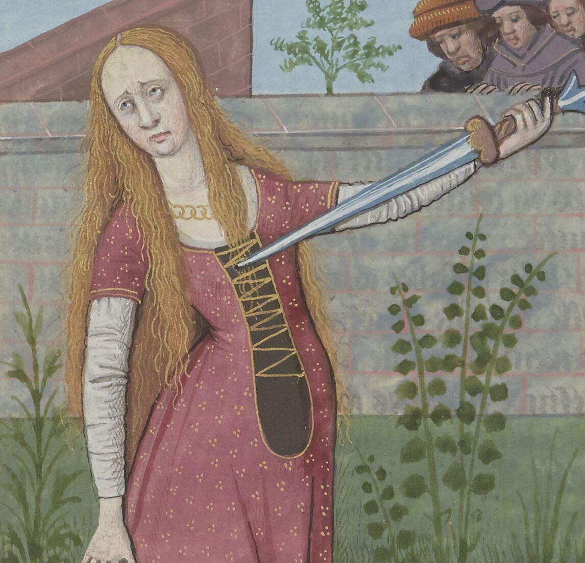 Boccaccio reserves some words for those women he considers illustrious. They are primarily selfless women, sacrificed, often martyrs, and, of course, chaste. Among them is Dido, the queen of Carthage, who, upon becoming a widow, "decided to die rather than violate her chastity" and committed suicide with a knife in front of her subjects. There is also the Roman Lucretia, who, after being raped, decided to sacrifice herself, uttering these words: "I absolve myself of the sin, but I cannot escape the punishment, and henceforth no dishonourable woman shall live with Lucretia as an example." Clearly, the Tuscan writer readily accepted female suicides.
