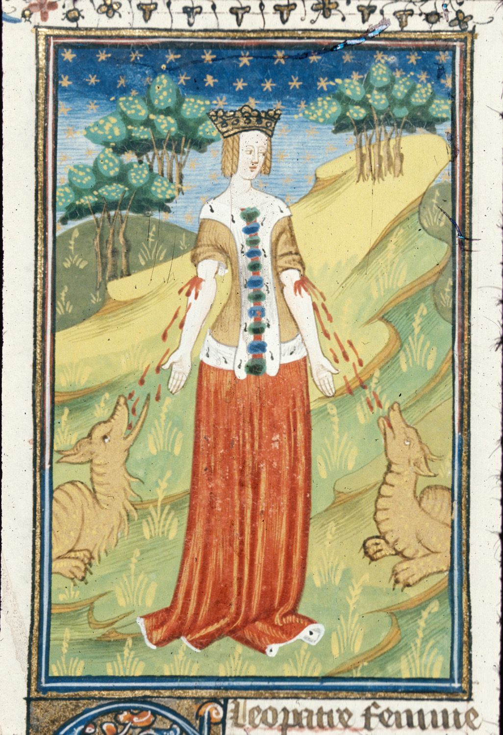 The suicide of Cleopatra was the subject of multiple speculations. Boccaccio himself provides several versions, joining the speculative tradition surrounding her death. In the 13th century, the General Estoria by the Spanish king Alfonso X the Wise (1221-1284) included two versions: one depicted Cleopatra placing the snakes in her veins, and the other in her breasts. Cleopatra's body had become a symbolic space, an eroticized yet disdainful place that embodied terror, desire, vice, and punishment.